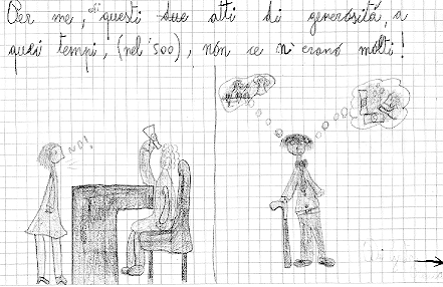 Chiara F. non ha “mai sentito una storia più significativa di questa”. Perché il gesto di Alasina stupisce i bambini? Greta, con un disegno dalle tinte gioiose, dà un colore allo stupore: Alasina urla “No!”, rinunciando a parte della dote; il notaio sorride e batte sul banco con il martelletto; lo sposo promesso di Alasina, generoso come lei, pregusta la gioia che darà a due poverette, lasciando a loro parte dei suoi beni.